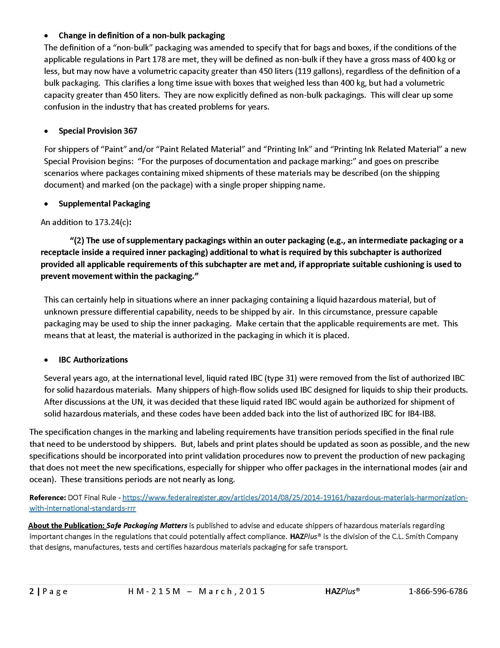 About the Publication: Safe Packaging Matters is published to advise and educate shippers of hazardous materials regarding important changes in the regulations that could potentially affect compliance. HAZPlus® is the division of the C.L. Smith Company that designs, manufactures, tests and certifies hazardous materials packaging for safe transport.